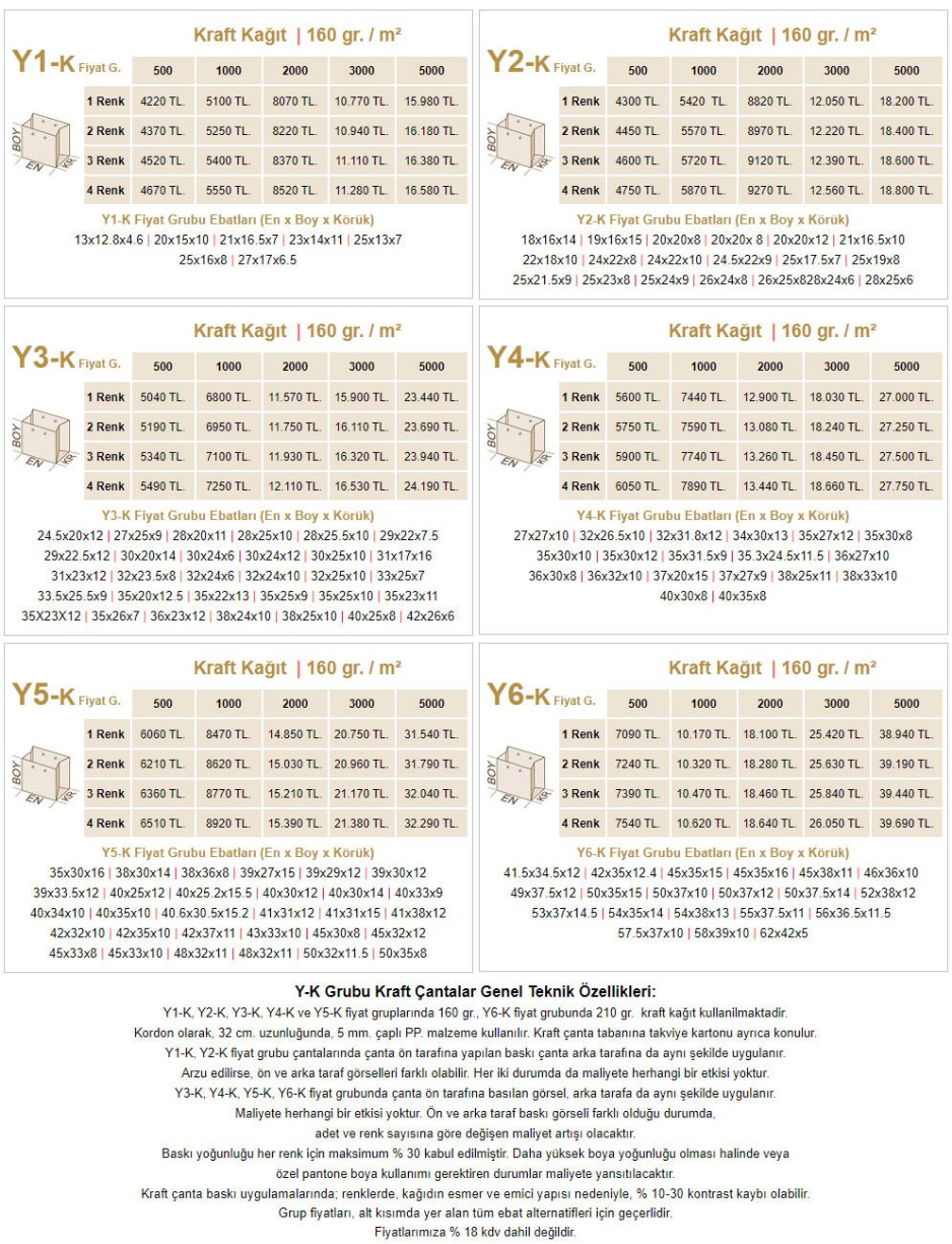 YATAY KRAFT POŞET FİYAT TABLOLARI